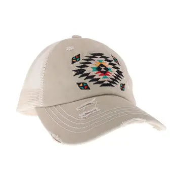 Jump on the trend with this all-new Western Aztec Embroidered High Pony Ball Cap. This hat fits everyone's favorites - distress design on a Criss cross cap with the cutest Aztec patch on the cutest colors!