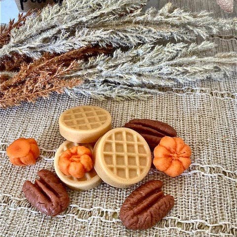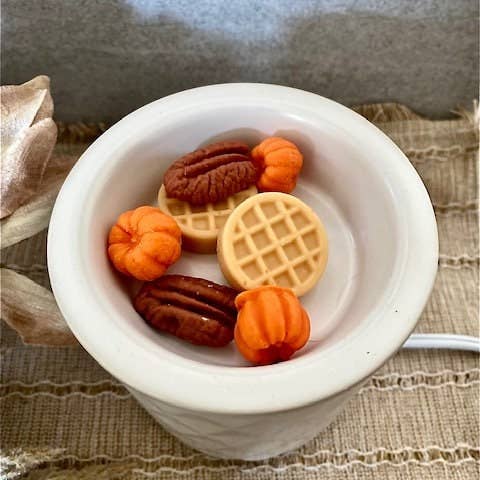 You are sure to love these Nutty Pumpkin Waffle Wax Melts. They smell amazing and are so cute with realistic looking mixture of waffles, pumpkins and pecans. They are a fall favorite and will fill your room with the aroma of buttery pecans, cinnamon, pumpkin, vanilla and maple syrup.