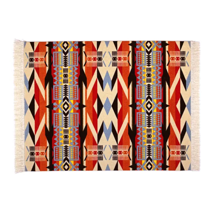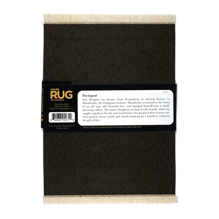 Fire Bringers are heroes, from Prometheus in classical Greece, to Manabozho, the Chippewa trickster. Manabozho journeyed to the home of an old man who hoarded fire, and changed himself into a small, shivering rabbit. The man’s daughters set him by the hearth, where he caught a spark on his fur and raced back to his people before it went out. This pattern shows combs and shawls warming by a hearth to celebrate the gift of fire. Design © Pendleton Woolen Mills, Inc. Made in the USA. Mouse Rug dimensions - approximate finished size: 7.125" x 10.25" (including fringe) and .16" thick.
