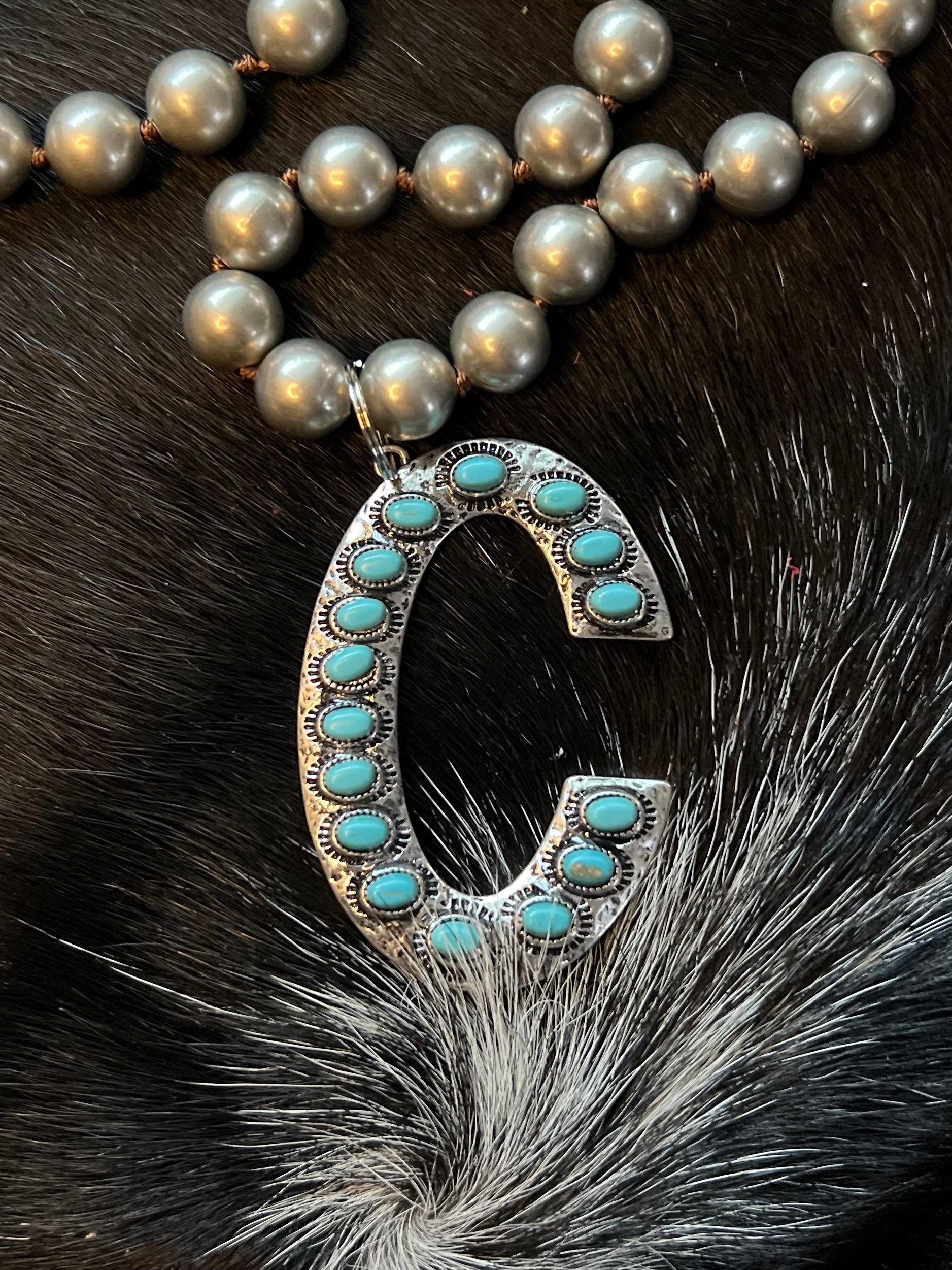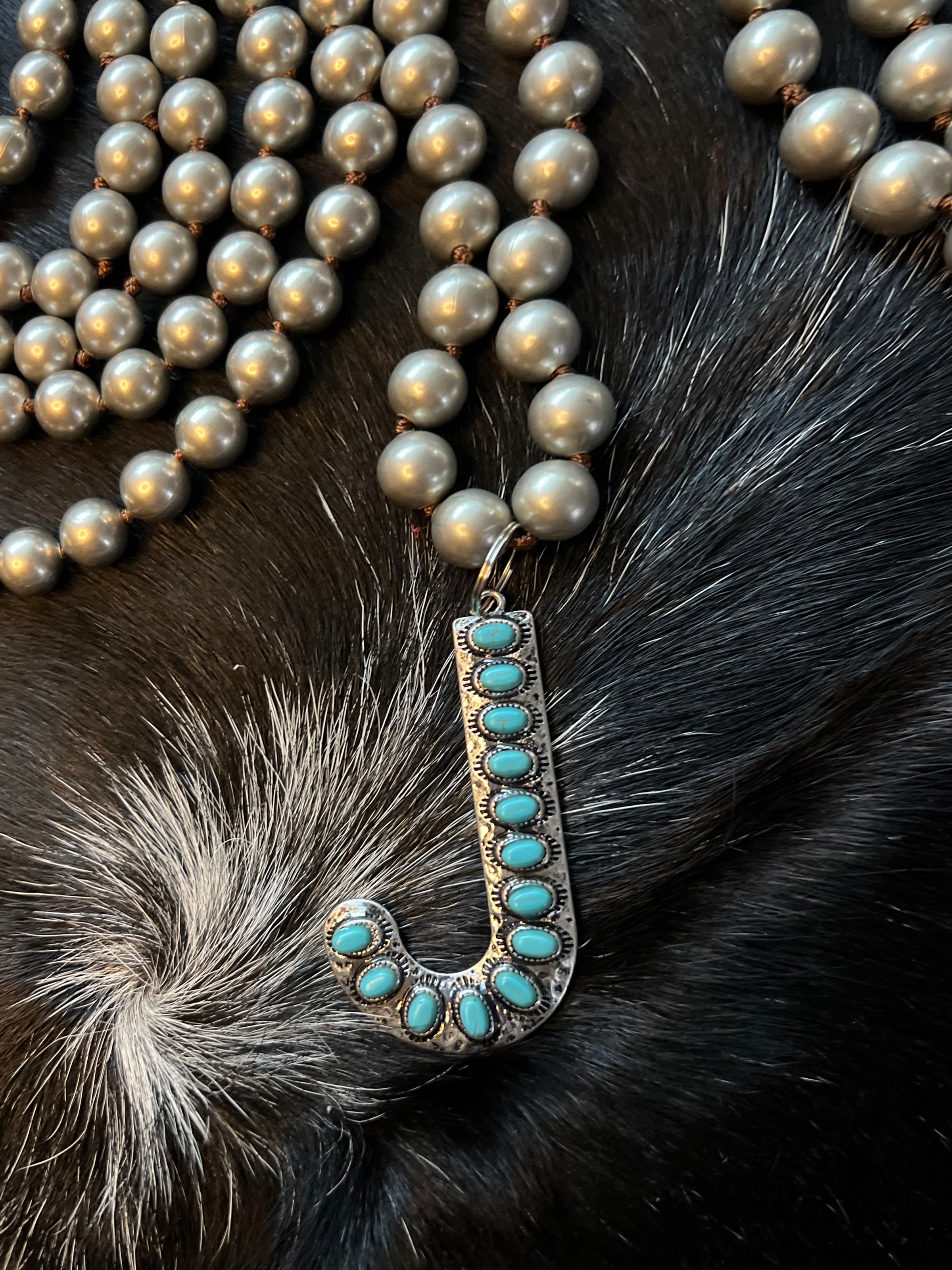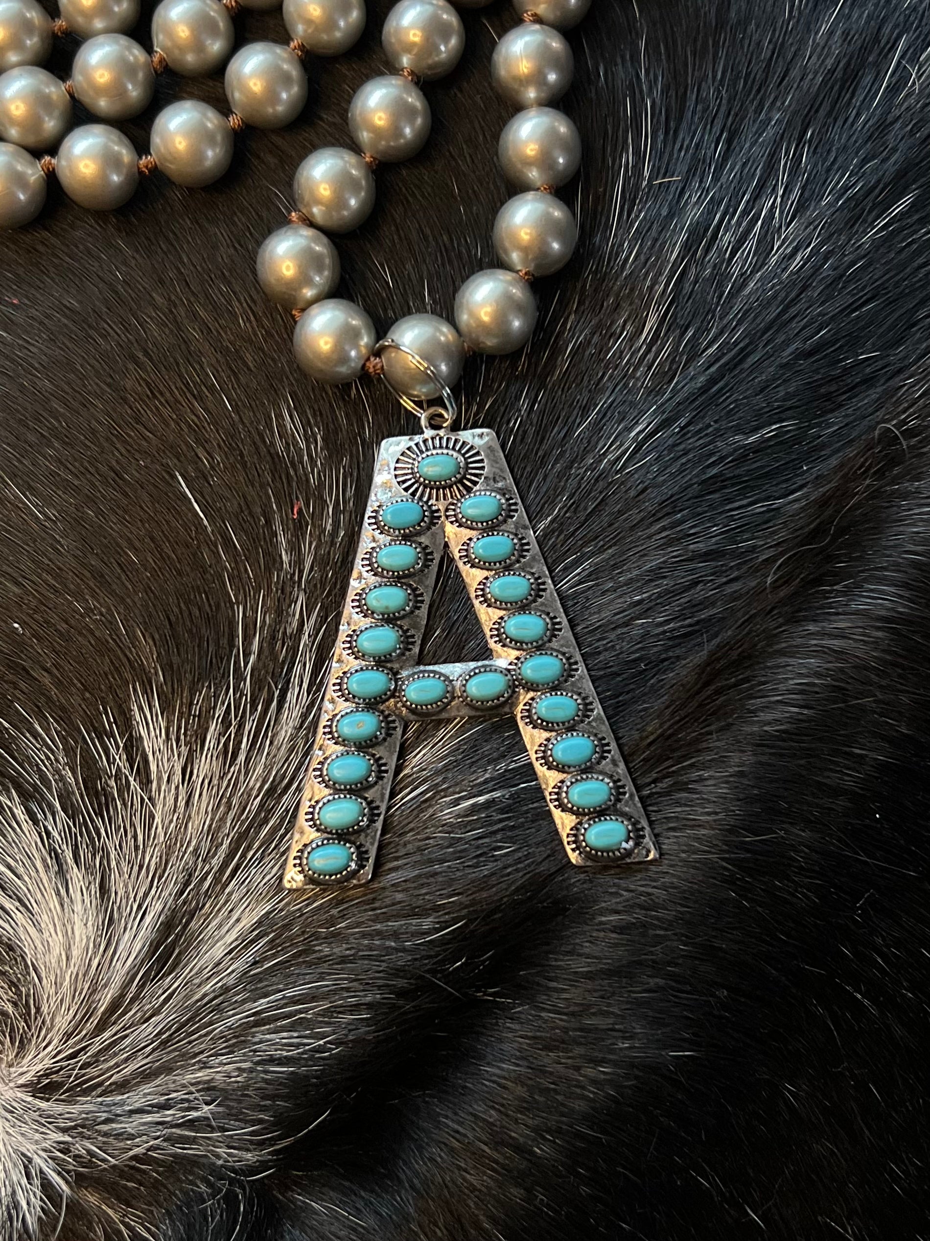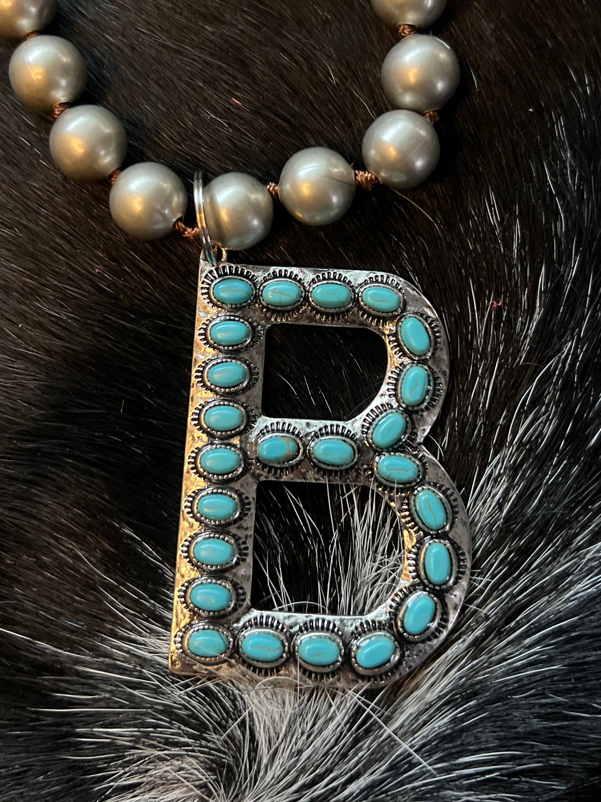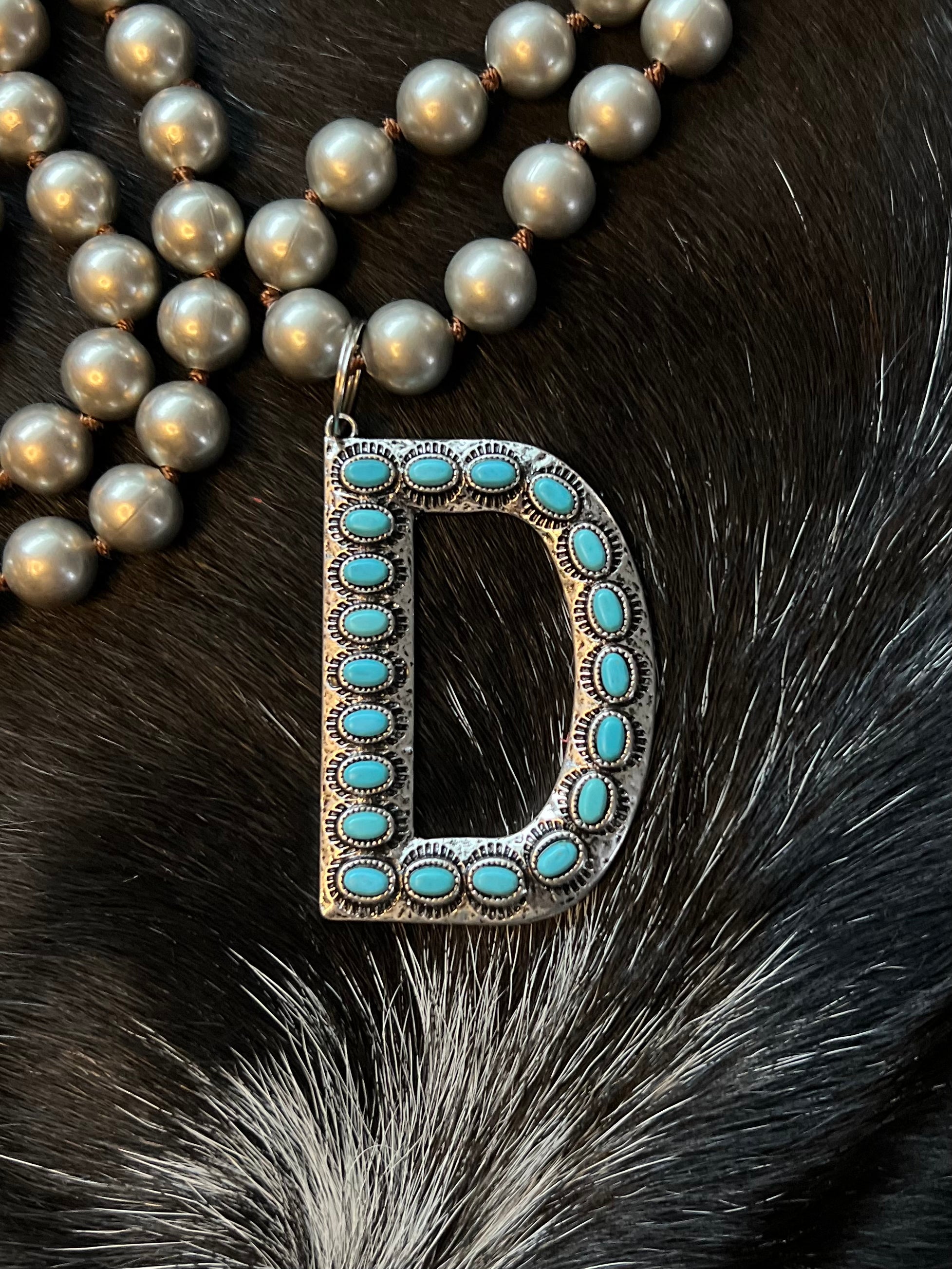 Detailed Large 2.5” faux Turquoise and Silver Initial Necklaces. Great to add to any outfit wonderful statement piece. Let me know if we you don’t see the initial you are looking for I can always special order them. Comes on Large Faux Navajo Pearl 18” Chain.