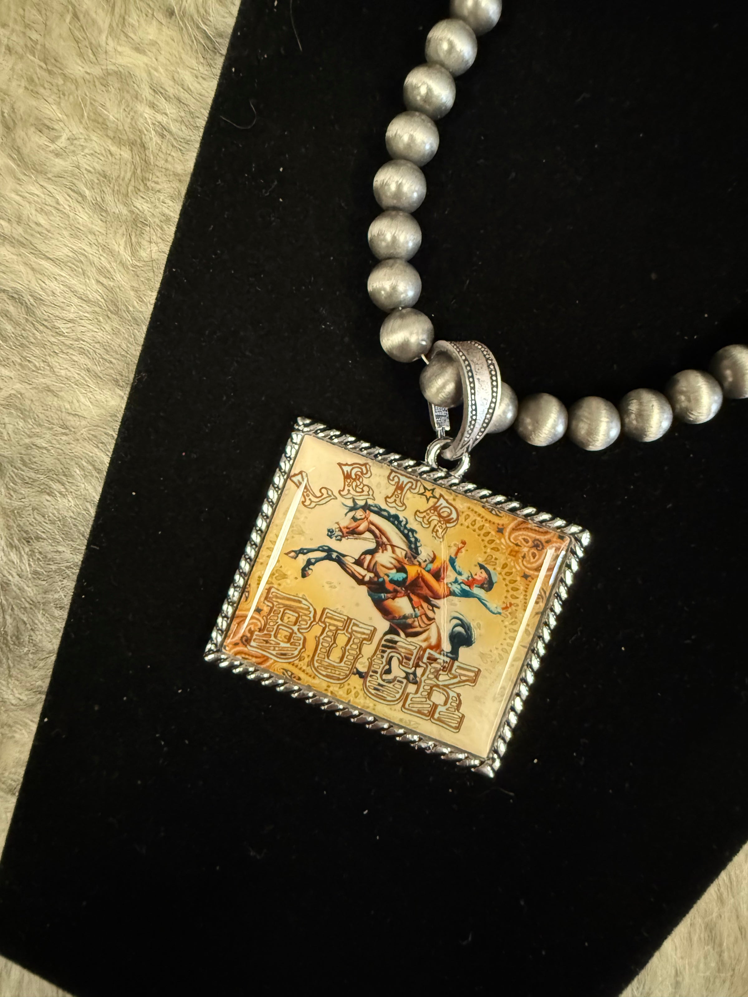 Elevate your western style with the Retro Let'r Buck & Rodeo Pendant Necklace, featuring a distinctive 2 x 2.5-inch pendant suspended on a 20-inch faux pearl bead chain. This piece offers versatility—wear it solo for a bold statement or layer with other favorites to create a personalized look that highlights your expert eye for western-inspired fashion.