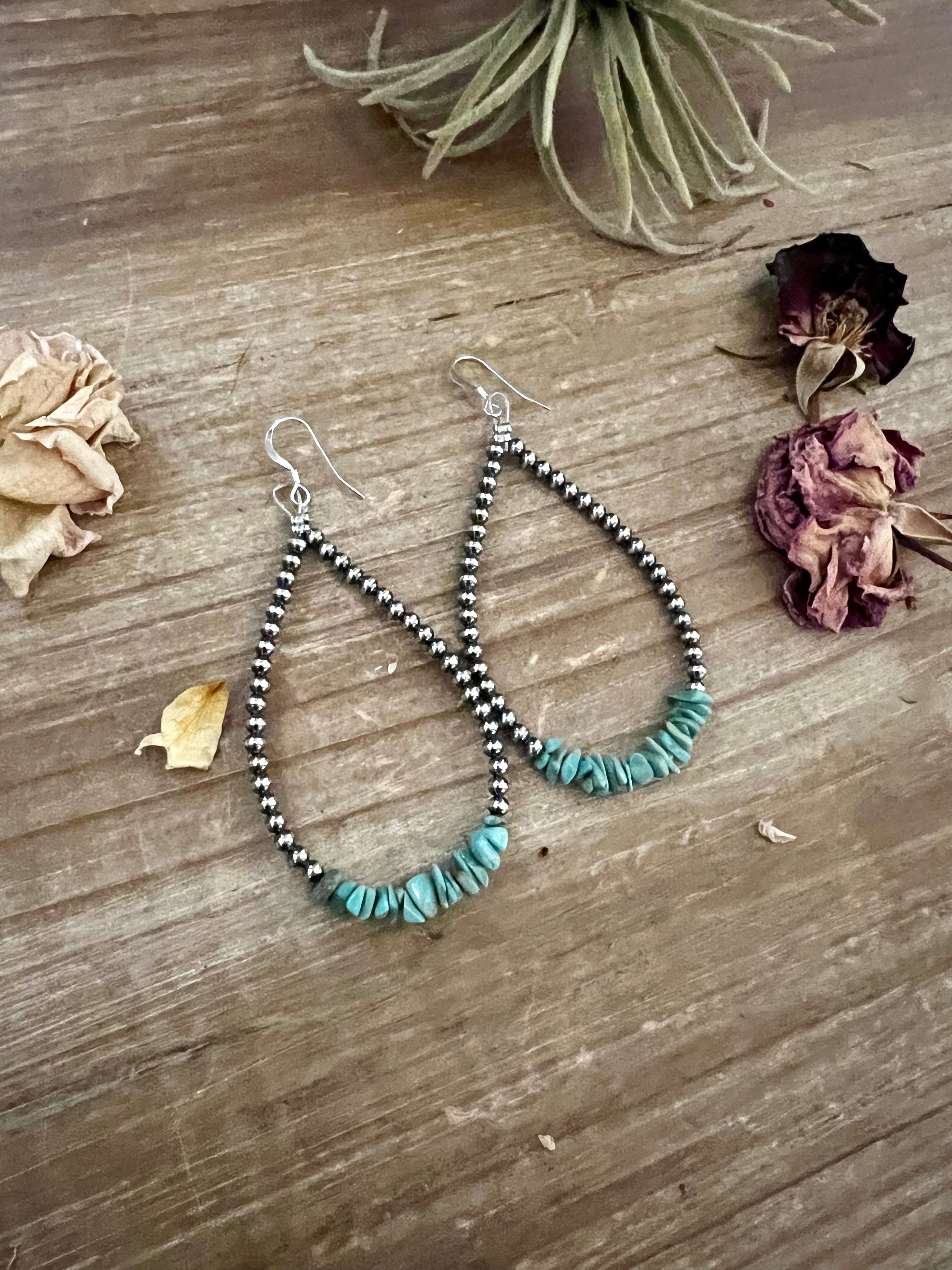 3 mm Sterling Silver Pearls earrings teardrop with real turquoise chips