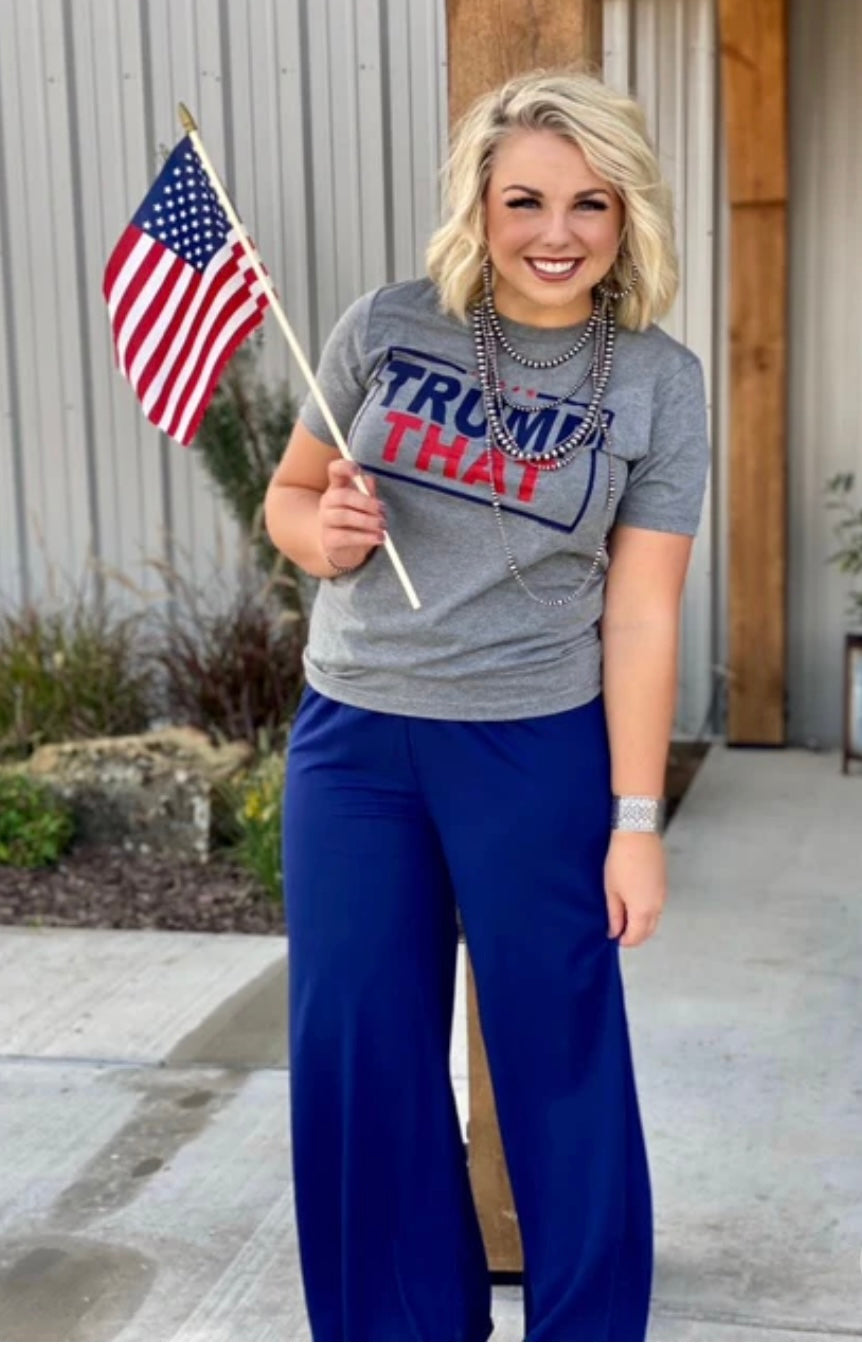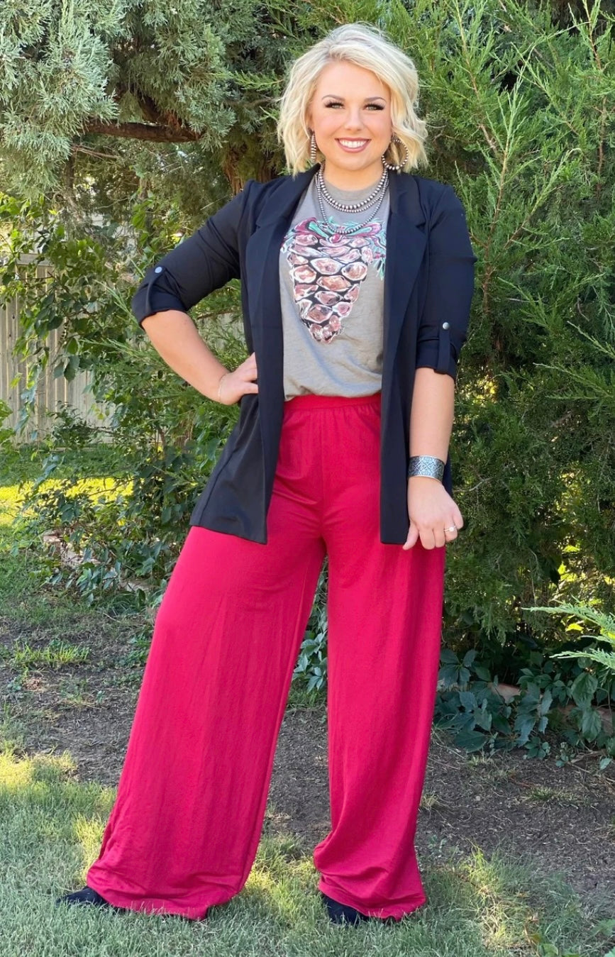 Y’all – these are just the funkiest little pair of wide-leg palazzo pants you’ve ever seen. They hit just right at mid-waist making your top’s front-tuck that much cuter! A true show-stopper you’ll want for dressier days catching the game.