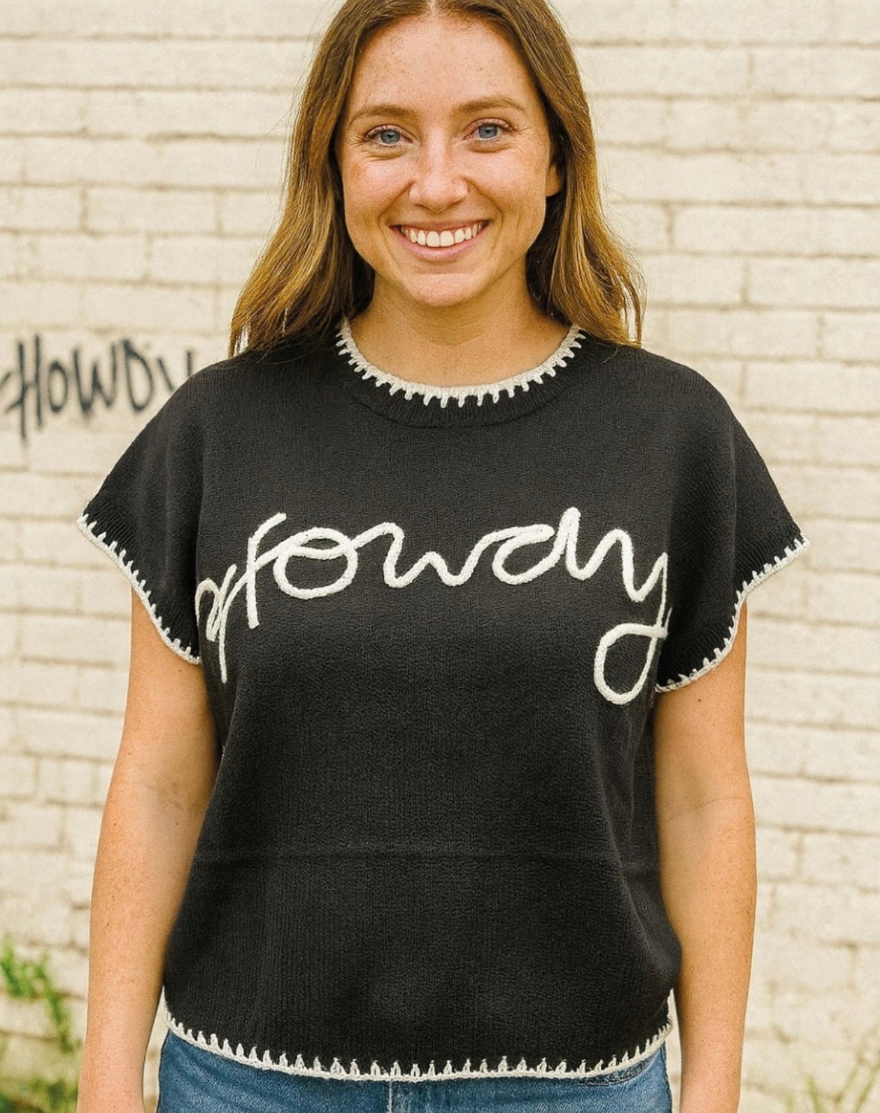 Say hello to cozy Western charm with this playful “Howdy” embroidered knit sweater top i Designed for the modern cowgirl with a love for casual comfort and a Western twist, this top features a relaxed silhouette, drop shoulder short sleeves, and soft sweater knit construction. The standout detail is the textured “Howdy” embroidery across the chest in a rich white yarn, adding a rustic, handcrafted touch that perfectly channels rodeo-ready spirit. The subtle contrast whipstitch detailing