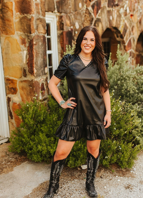 Elevate your western fashion with this edgy and feminine Black Faux Leather Dress. Featuring a soft faux leather fabric with a flattering silhouette, this mini dress boasts puff sleeves, a v-neckline accented with silver stud detailing, and a flirty ruffle hem that adds just the right amount of flair. The structured shine of the leather-look finish gives it a bold cowgirl-meets-rockstar aesthetic—perfect for rodeo nights, country concerts, or western-themed events. Pair with boots and turquoise accessories for a powerful, trend-forward western look.