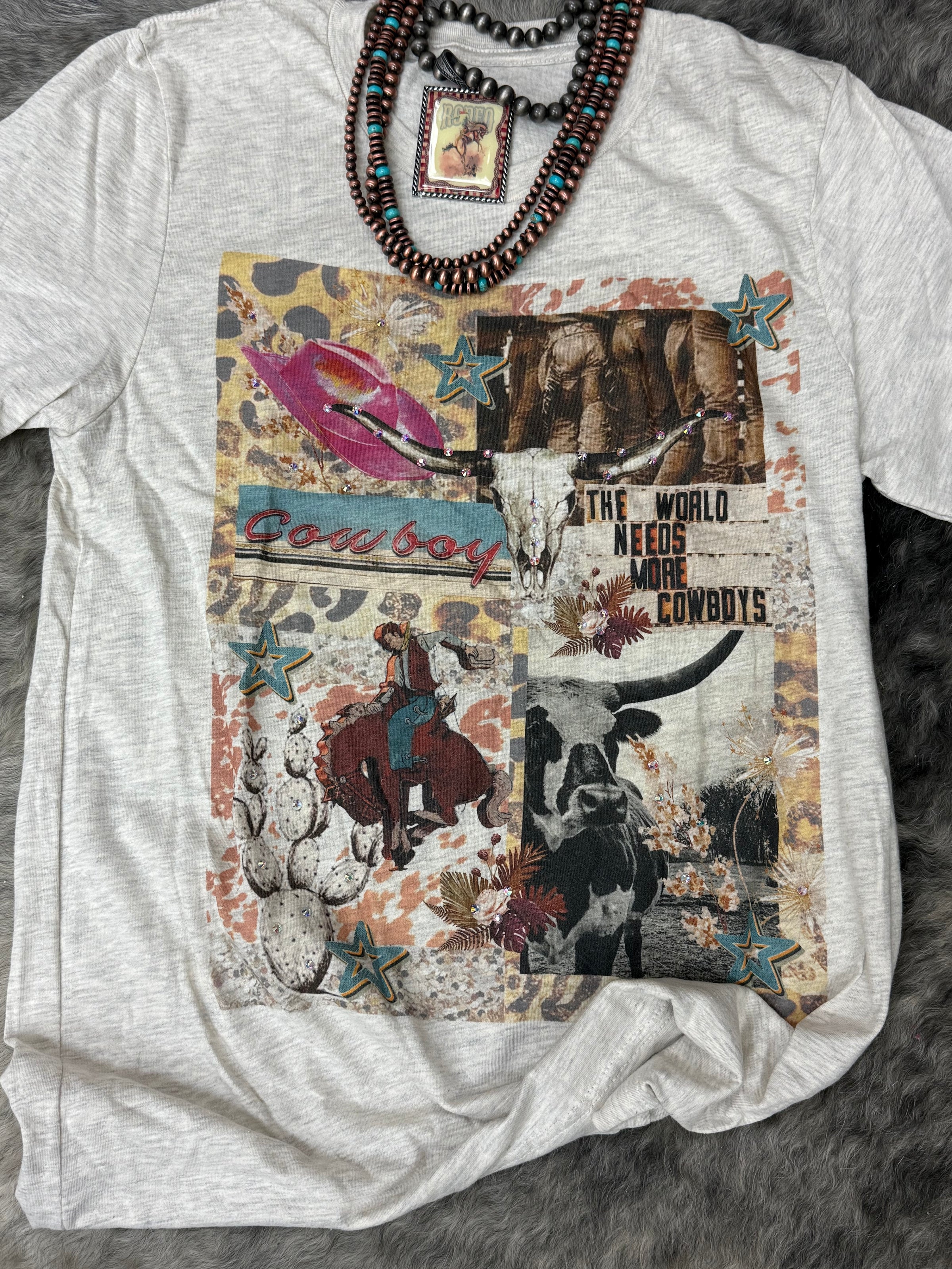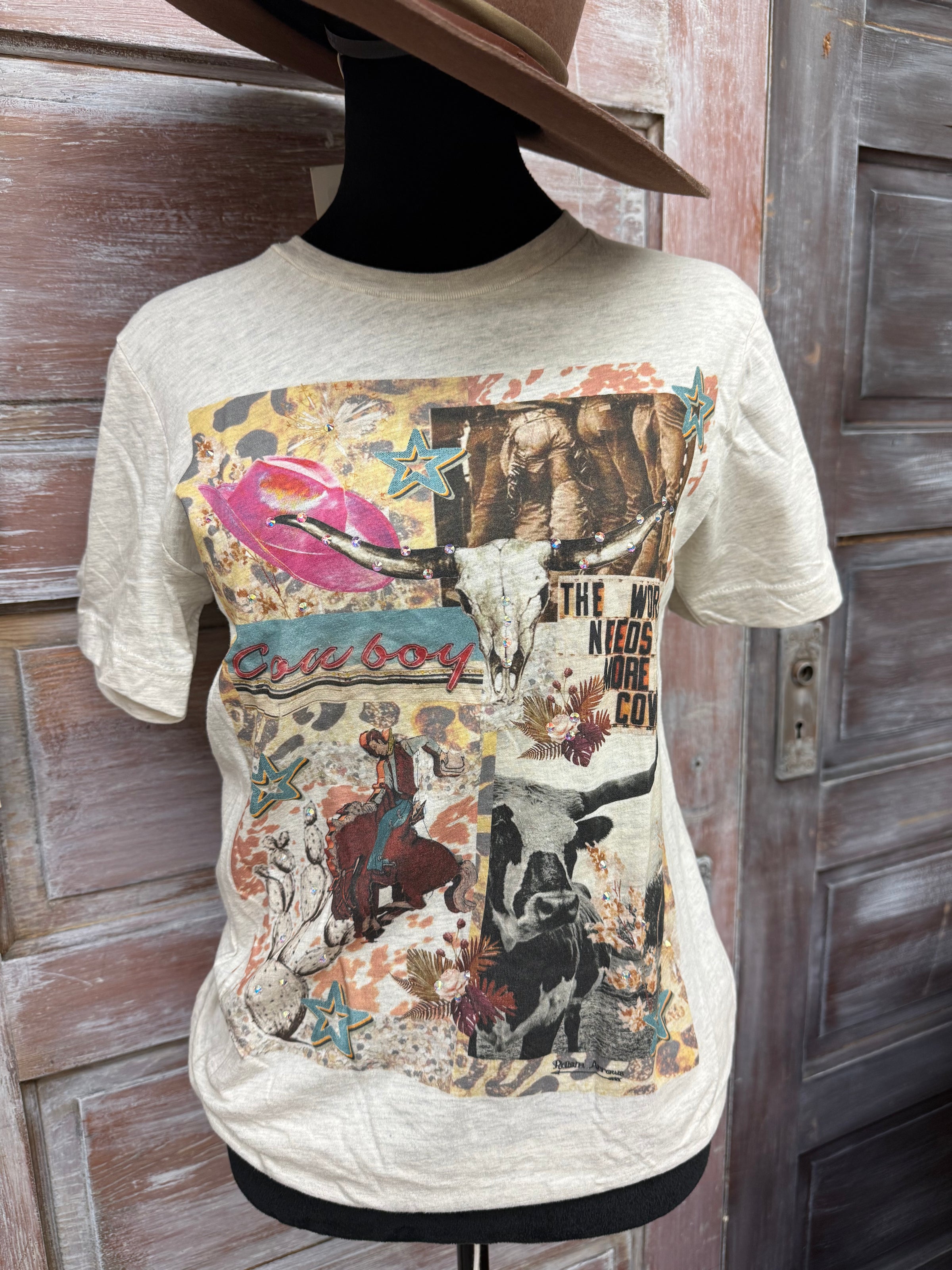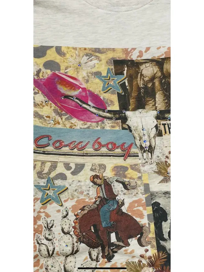Add a touch of sparkle to your wardrobe with the Bedazzled More Cowboy's Please Graphic T. Featuring a unique cowboy collage design accented with subtle embellishments, this tee brings Western charm to everyday wear. Perfect for those who want to express their love for cowboy culture while enjoying a stylish, eye-catching look.
