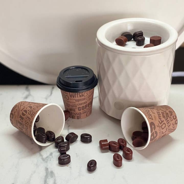 Indulge in the rich aroma of our handcrafted coffee bean wax melts. Made from a blend of high-quality soy blend wax, each melt releases an intense coffee bean fragrance. Place as many wax melts as needed in our wax warmer to achieve your desired scent intensity. Packaged in a charming coffee cup with a lid, these wax melts make a perfect gift or addition to your home decor.