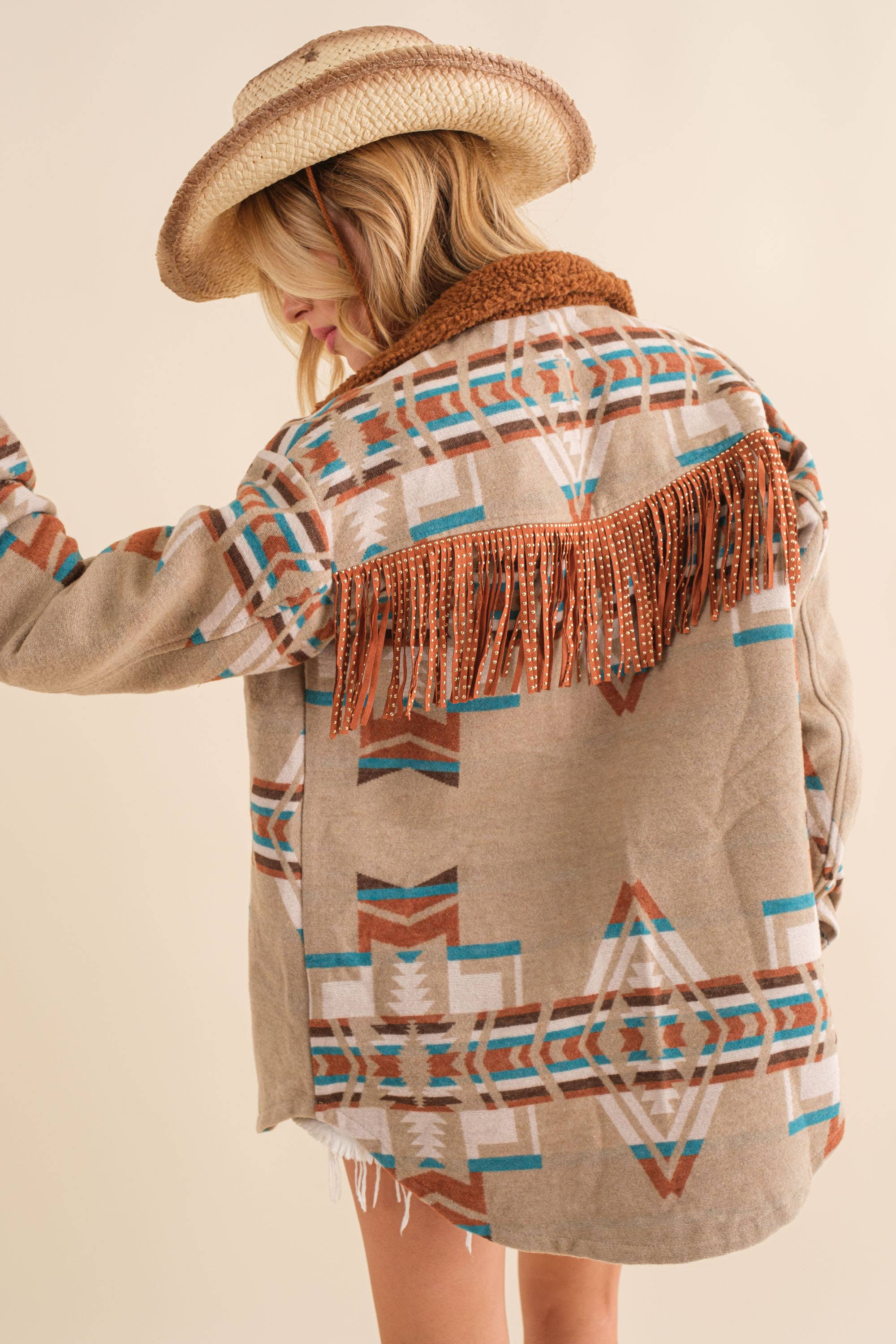 Exclusive Jacquard Aztec Sherpa Collared Button Up Western Shacket. The colors on this one is amazing. Great shacket with the Sherpa collar makes it that much nicer.