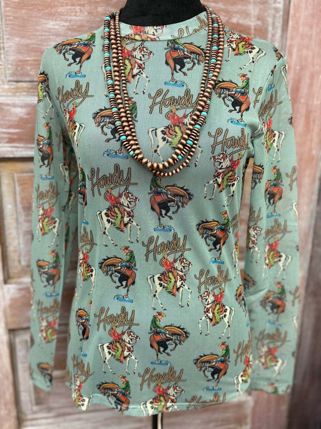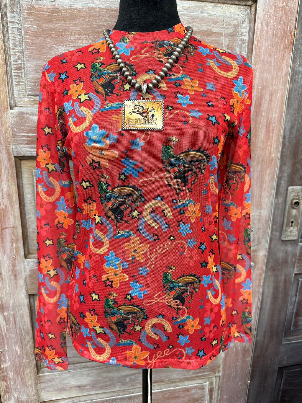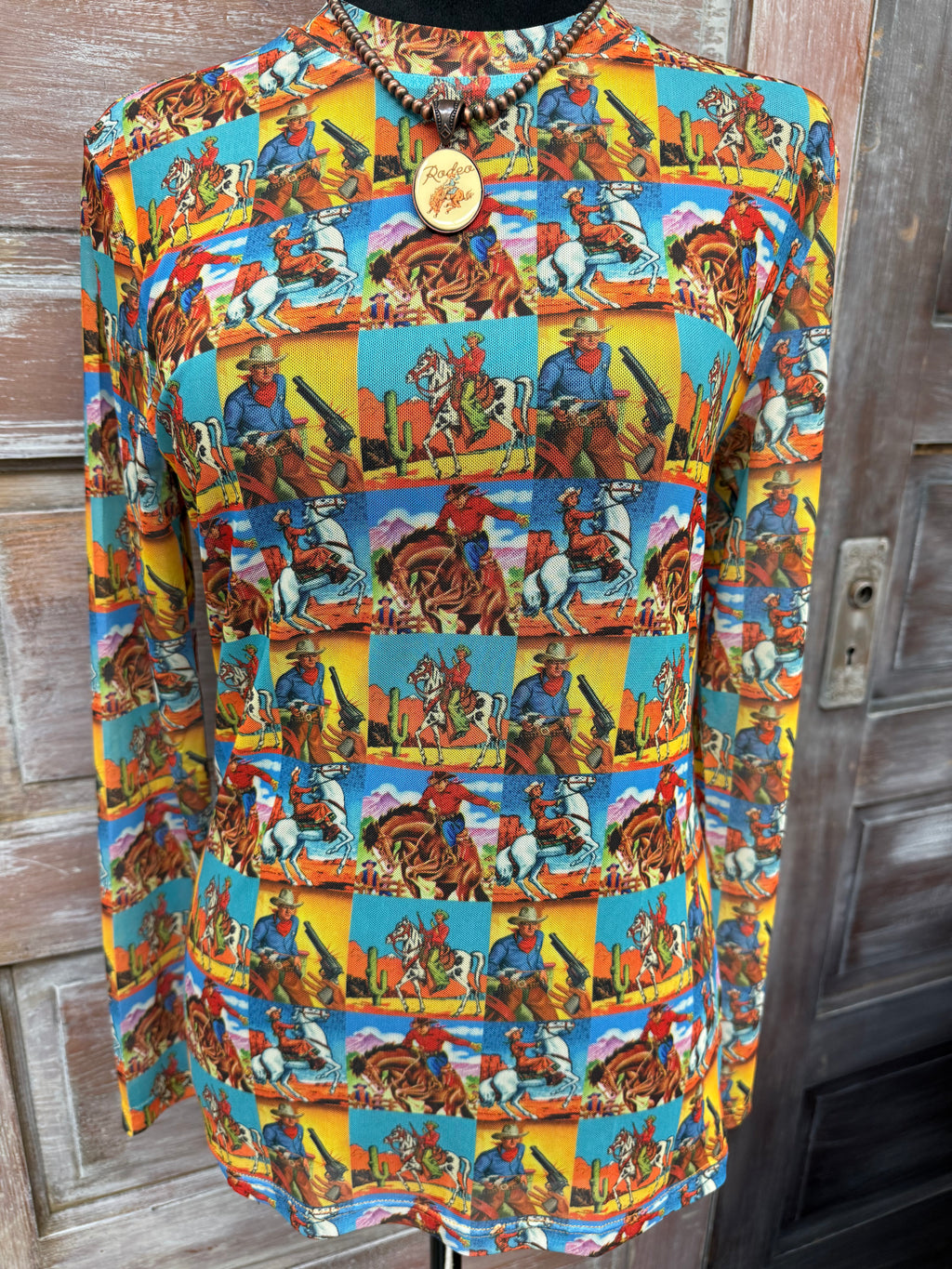Retro Comic Cowboys Long Sleeve Mesh Top
