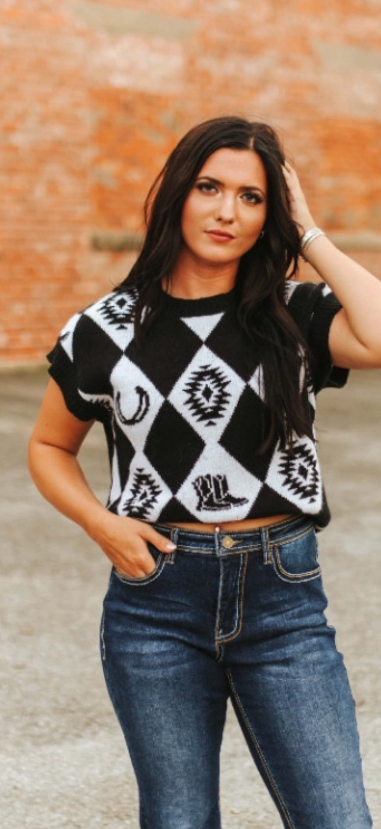 The Lucky & Blessed Black Diamond Checkered Western print sweater delivers versatile styling for any occasion. Crafted from a premium blend of 52% acrylic, 28% nylon, and 20% polyester, this piece offers durability and comfort. Wear it as a standalone statement or layer it effortlessly over mesh or long-sleeve tops for added dimension. The classic checkered western print brings authentic character to your wardrobe while the quality construction ensures lasting wear season after season.