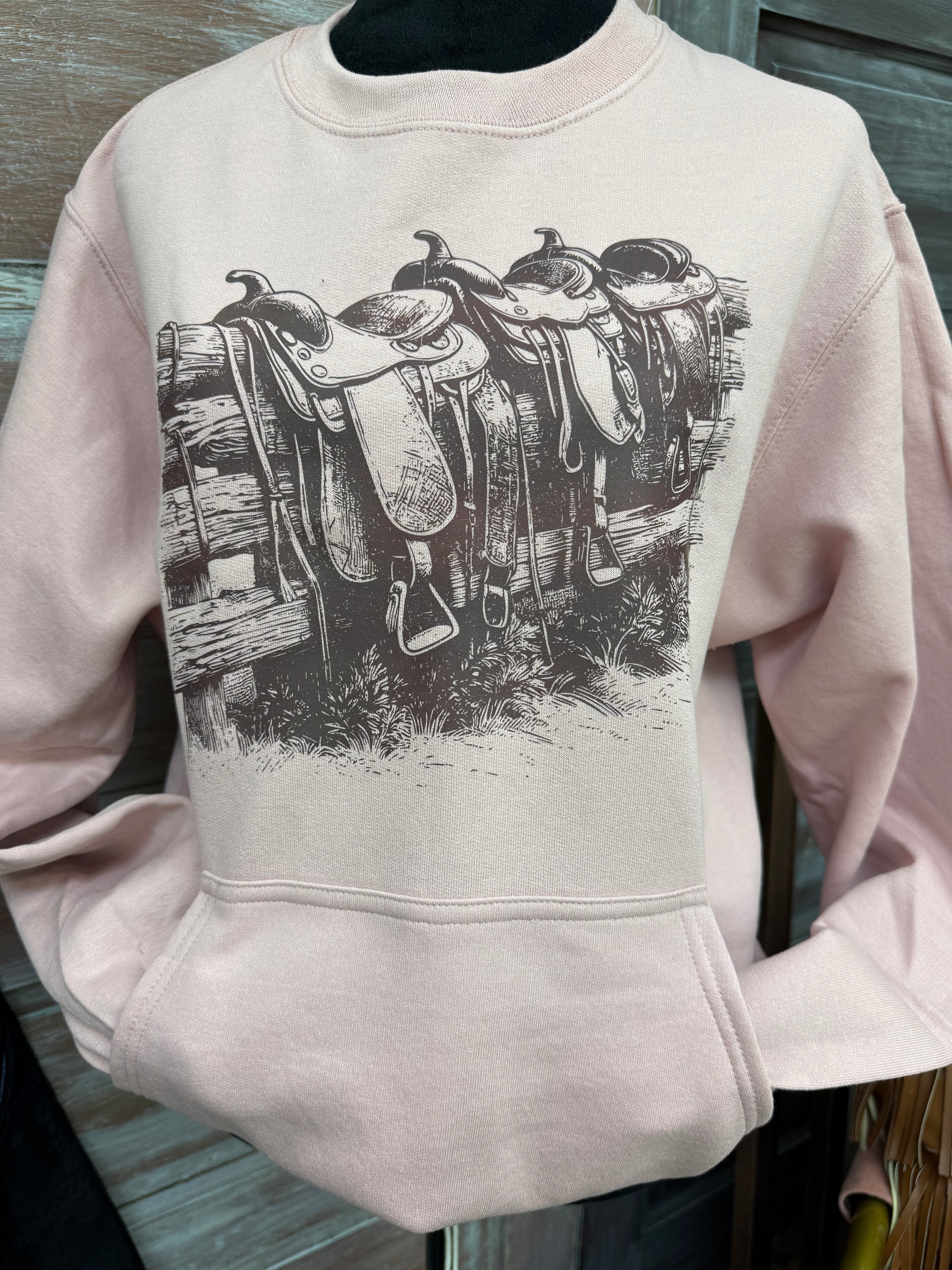 The Blush Pink Western Saddles Pocketed Crewneck combines comfort with style, featuring a soft blush pink hue and a distinctive Western Saddles graphic. Designed with convenient pockets, this crewneck offers practical warmth and a relaxed fit, making it an essential layering piece for casual wear. Its popularity among fans attests to its versatile appeal and dependable comfort.