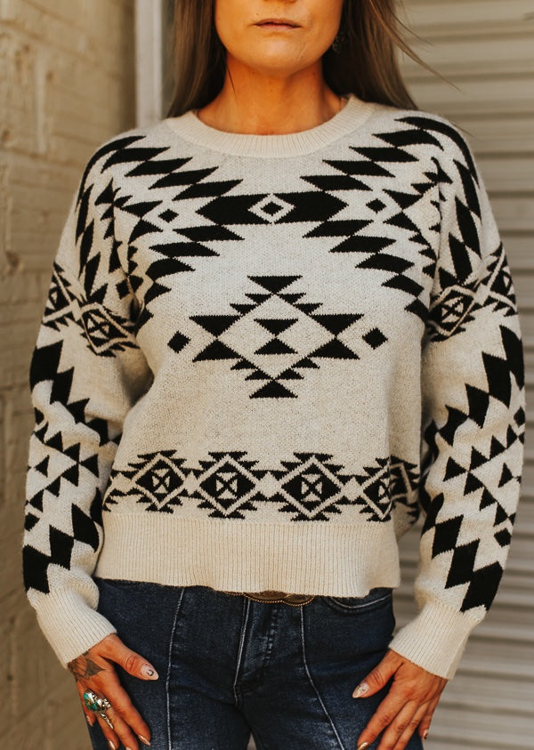 Embrace Western sophistication with this Ivory & Black Aztec Knitted Sweater, a piece that captures the spirit of classic Southwestern style. The expertly curated fiber blend—39% acrylic, 31% polyester, and 30% polymide—ensures a luxuriously soft hand feel without sacrificing durability or easy maintenance. Perfect for those who appreciate authentic Western aesthetics, this sweater seamlessly transitions from professional settings to evening occasions. The bold geometric Aztec pattern in timeless ivory and black adds character and depth to any outfit, while the long sleeves provide elegant coverage. Quality construction means it resists wear and maintains its shape, making it a reliable staple for the modern Western wardrobe. A refined choice for those with discerning taste.