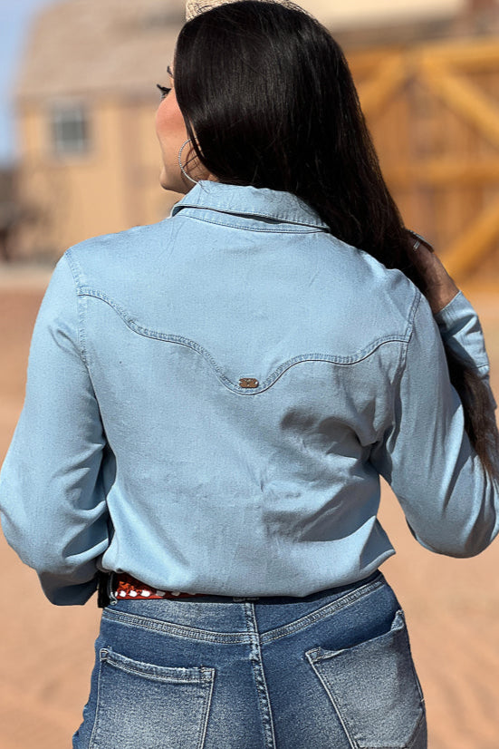 This light wash western pearl snap long sleeve is the perfect addition to your wardrobe. Made with plus size comfort in mind, its classic design and pearl snap buttons give it a stylish touch. Featuring a light wash, this shirt is versatile and can be dressed up or down for any occasion.