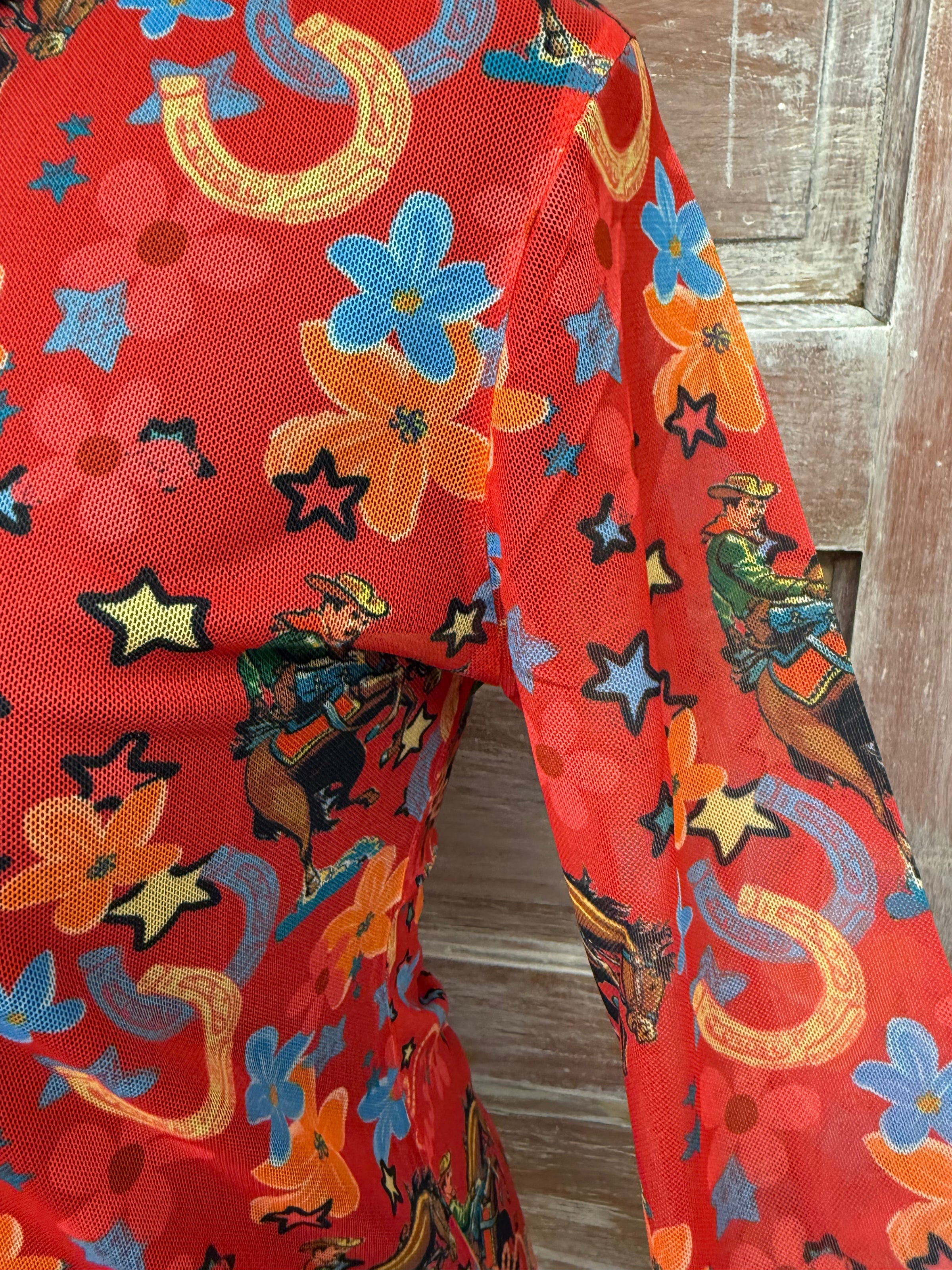 Add a vibrant touch to your wardrobe with the Red Yeehaw Mesh Top. Featuring colorful floral accents, horseshoes, and bucking horses, this unique piece blends western charm with playful style. Crafted from a comfortable 95% polyester and 5% spandex blend, it’s perfect to wear layered under a favorite tee, tank, or Cami for an effortlessly stylish look.