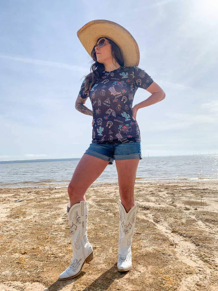 Decked out in symbols of the old west, this versatile, black/white/turquoise/red, short sleeve mesh top is your new best seller. Style it with absolutely anything, from denim and chambray to graphic tanks to blazers.