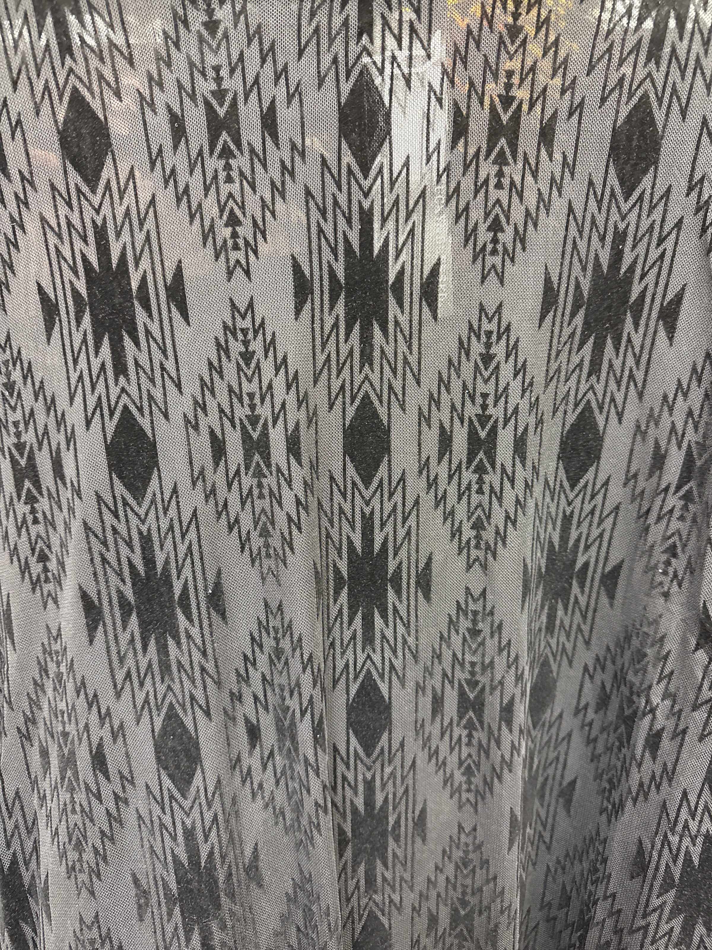 The Black Aztec Burnout Mesh Long Sleeve Top combines contemporary edge with southwestern flair. This long sleeve mesh piece features a striking aztec print rendered in luxurious velvet burnout fabric, creating depth and visual interest. Crafted from a premium blend of 97% polyester and 3% spandex, the fabric offers stretch and durability while maintaining its distinctive texture. Available in Extra Luscious Sizes, this versatile top works equally well layered under jackets or worn as a statement piece on its own.