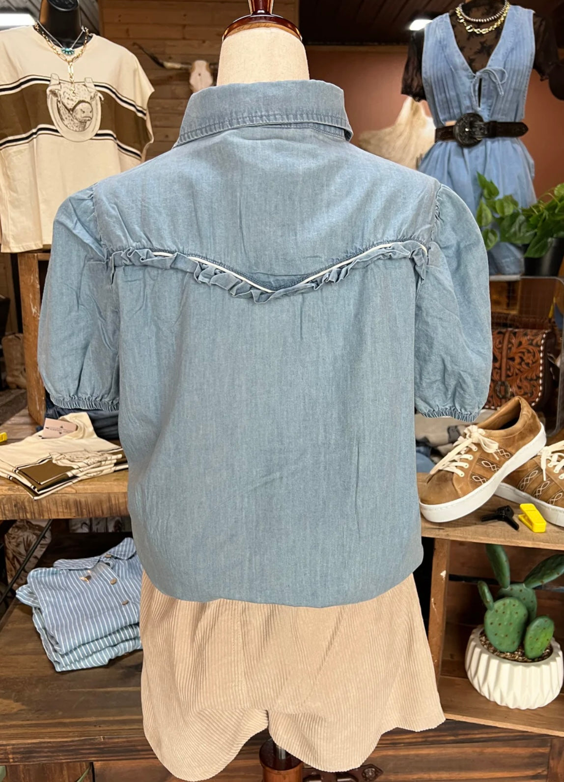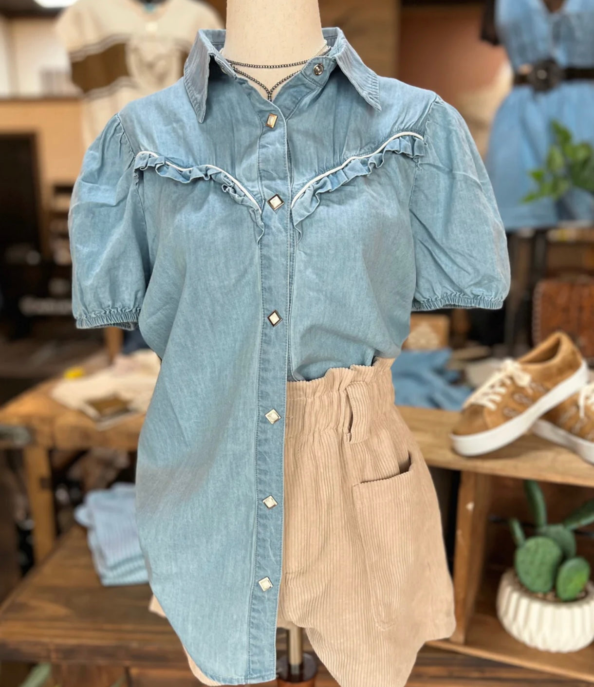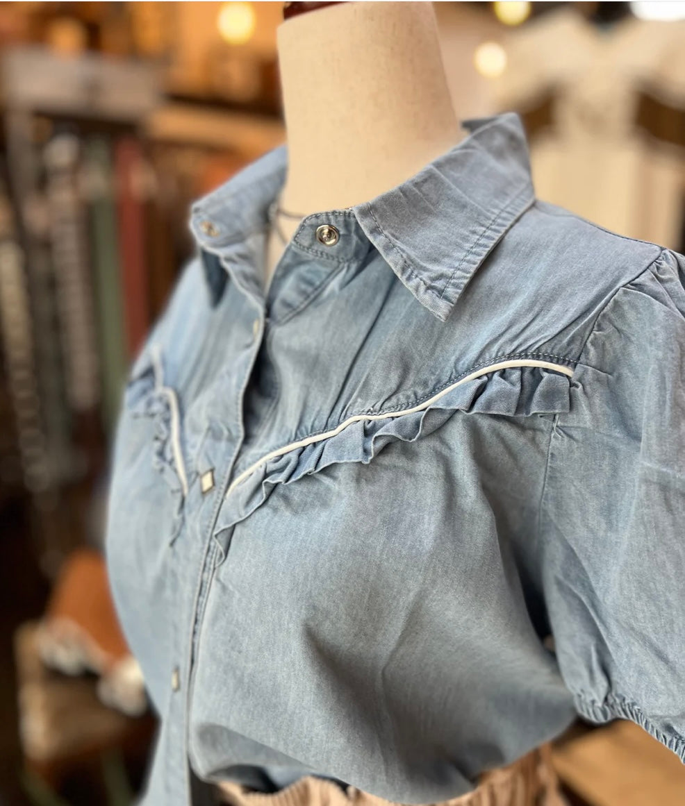 The Rowdy Ruffle Pearl Snap Blouse combines western-inspired design with subtle femininity. Crafted from a soft cotton-tencel blend in light wash denim chambray, it ensures comfortable wear and durability. The distinctive ruffle yoke adds a playful dimension to the classic pearl snap closure, while puff sleeves introduce refined volume and style. This blouse offers an elevated take on casual western wear, suitable for both everyday looks and more polished ensembles.