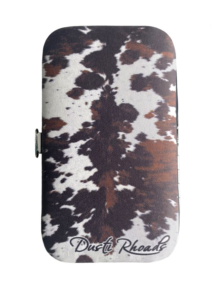 Cattle Drive faux leather manicure set features our signature cowhide print design on the front and back of the casing. On the inside, you will find 8 black metal tools that help with the nail prep and application process. It includes a traditional set of nail clippers, an angled set of nail clippers, a pair of cuticle scissors, a metal nail file, a cuticle scrapper, a pair of tweezers, a cuticle cutter and a special tool to help you pick your nail polish strips off the paper. The inside of the casing is black.