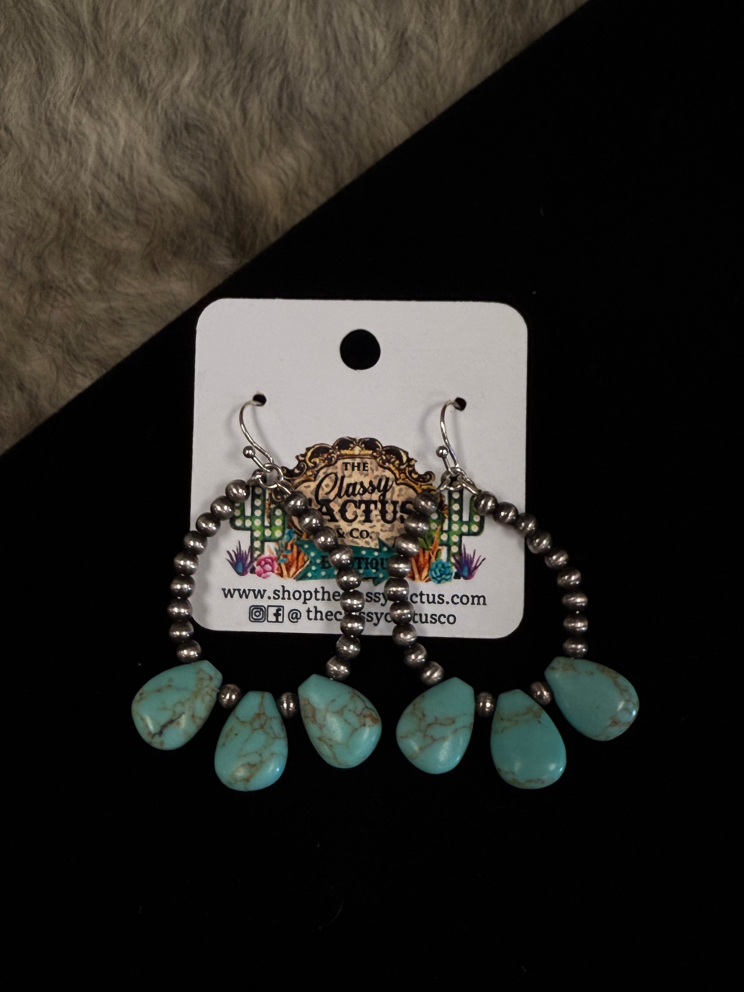 These teardrop earrings feature Faux Silver Pearl beads and turquoise stone teardrops.