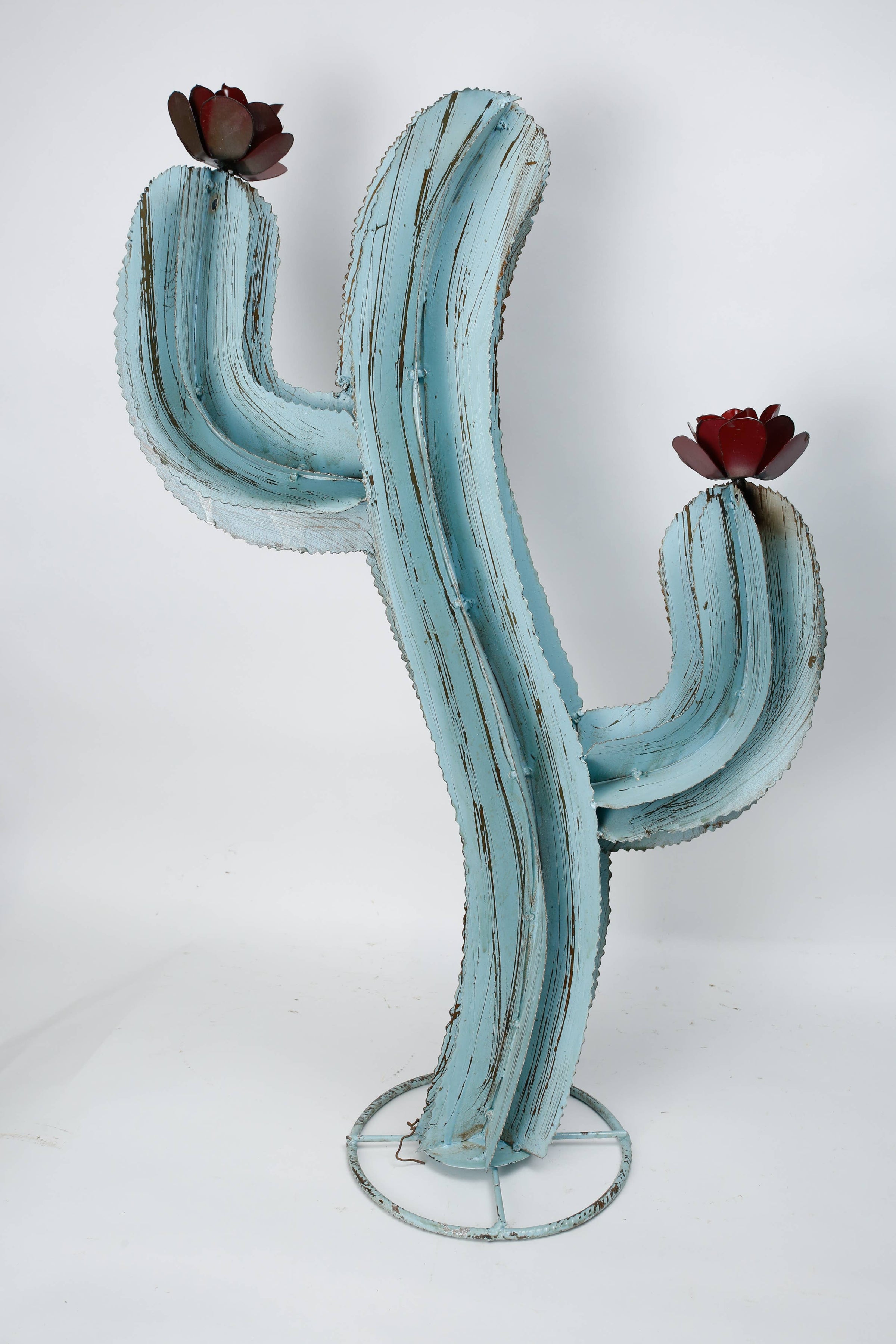 Each individually the uniqueness and one of a kind of these cute cactus is sure to bring warmth to any home or garden. We will offer 3 colors and 2 sizes. These medium size measure about 24W x 9D x 34H inches. If you are putting them outside, we suggest several coats of a sealer, ie, polyurethane or sparathane. NOTE: Keep in mind that these are rustic, handmade, and not machine-made. Their beauty is in their uniqueness and not machine-made type decor. They'll be knicks, welds, scratches, etc.. Size and color tones may vary a bit as each is handmade. NOTE: These are rustic and you WILL see scratches, blemishes, weld marks, etc.. all normal. So please buy accordingly. Metal is pliable so it is easily bent back into shape in case it may bend a bit during shipment. Keep that in mind. That is not damaged.