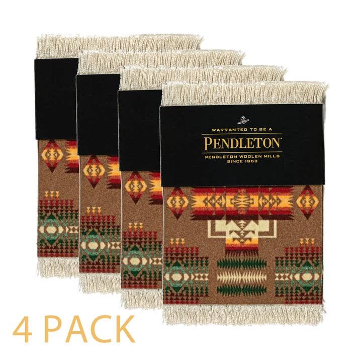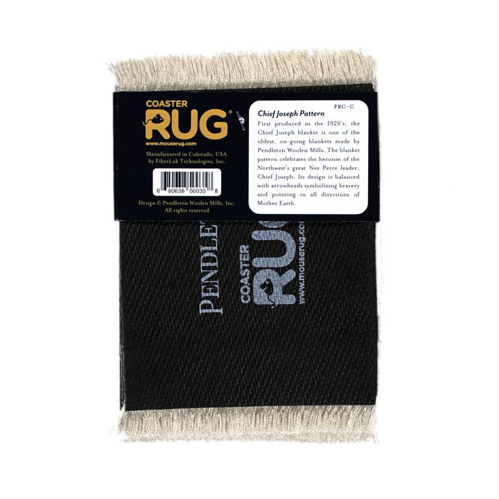 Coaster Rugs come in a set of four with a descriptive paper packaging that includes the name of the pattern, its history and origin. First produced in the 1920s, the Chief Joseph blanket is one of the oldest ongoing blankets woven by Pendleton Woolen Mills. The pattern celebrates the heroism of the great Nez Perce leader with a balanced design of arrowheads pointing in all directions of Mother Earth. Chief Joseph, known by his people as In-mut-too-yah-lat-lat (Thunder Coming Up Over the Land from the Water), assumed his role as Chief in 1877. Design © Pendleton Woolen Mills, Inc. Made in the USA. Coaster Rug dimensions - approximate finished size: 3.5" x 5.5" (including fringe) and .16" thick.