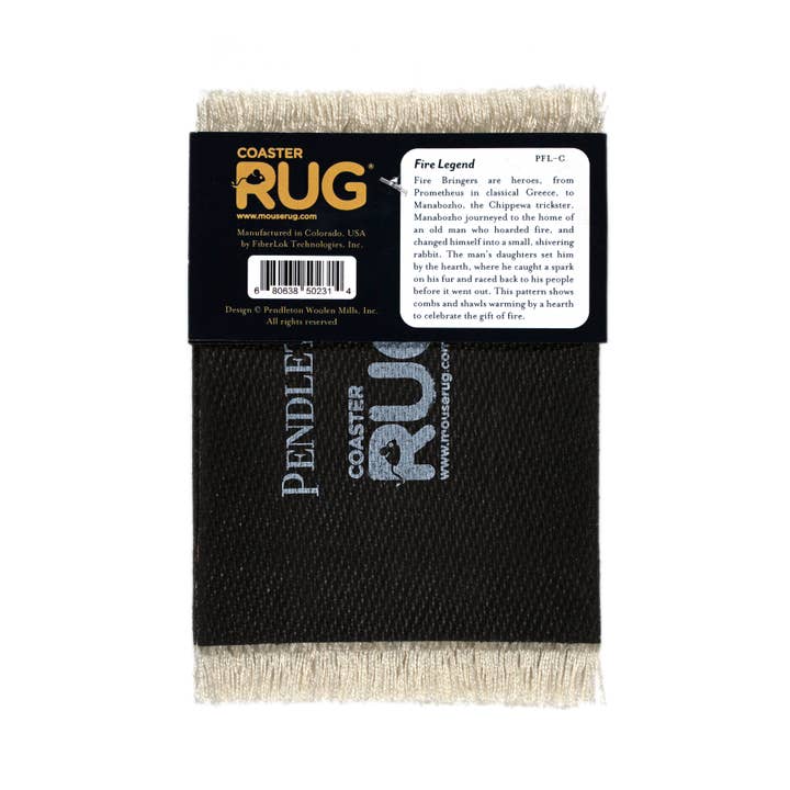 4 Sets of Coaster Rugs Coaster Rugs come in a set of four with a descriptive paper packaging that includes the name of the pattern, its history and origin, Fire Bringers are heroes, from Prometheus in classical Greece, to Manabozho, the Chippewa trickster. Manabozho journeyed to the home of an old man who hoarded fire, and changed himself into a small, shivering rabbit. The man’s daughters set him by the hearth, where he caught a spark on his fur and raced back to his people before it went out. This pattern shows combs and shawls warming by a hearth to celebrate the gift of fire. Design © Pendleton Woolen Mills, Inc. Made in the USA. Coaster Rug dimensions - approximate finished size: 3.5" x 5.5" (including fringe) and .16" thick.