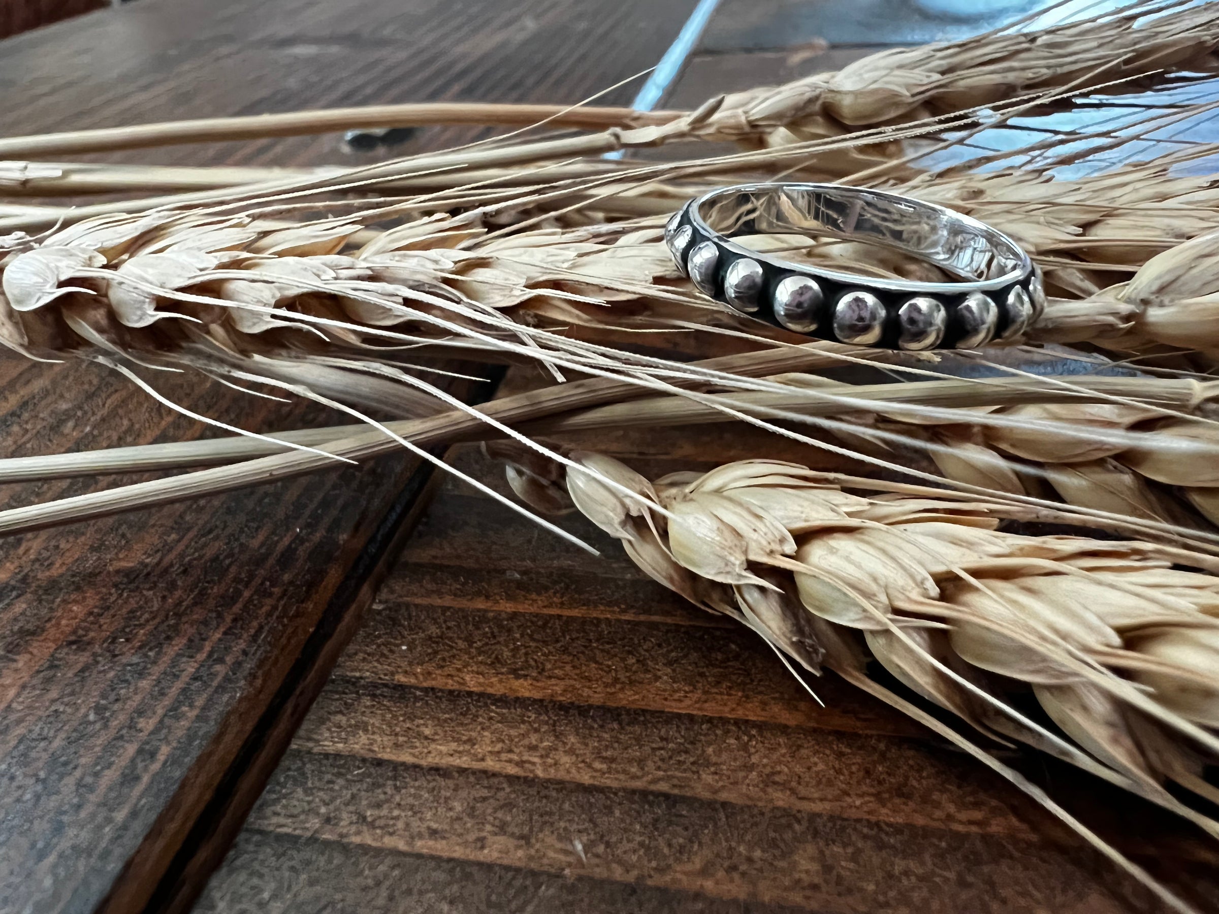 Sterling Silver 3m pearls completely around the band. Comfort fit band